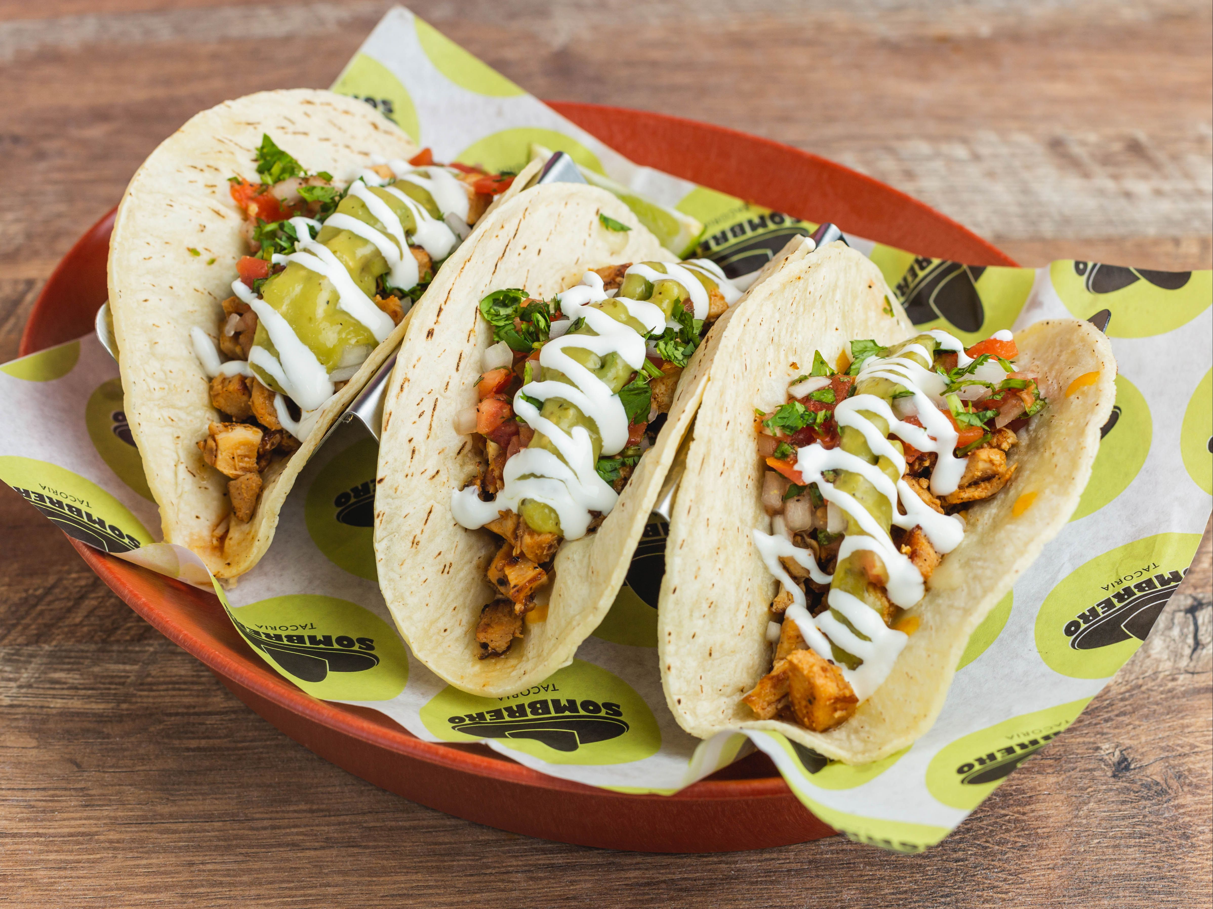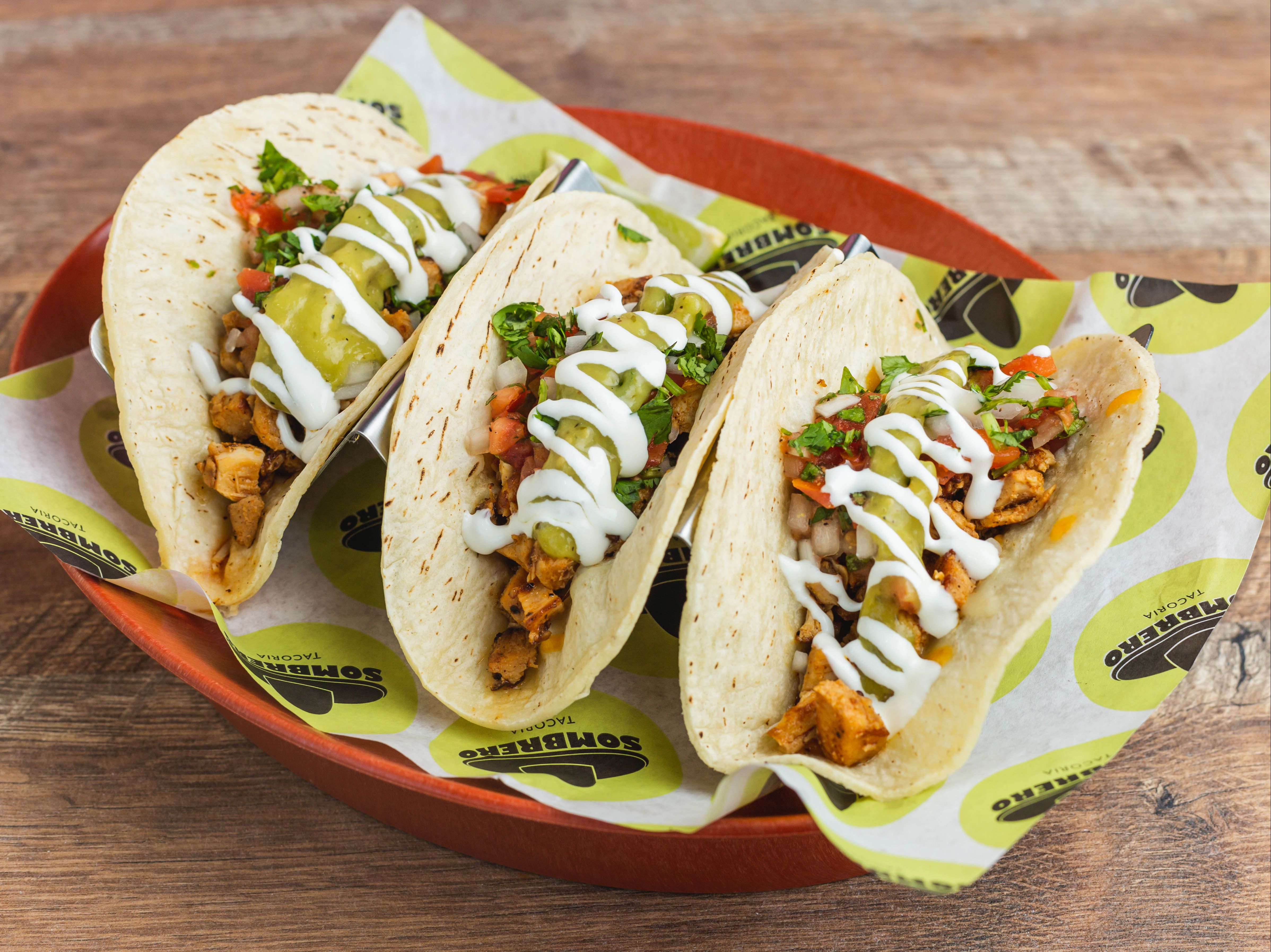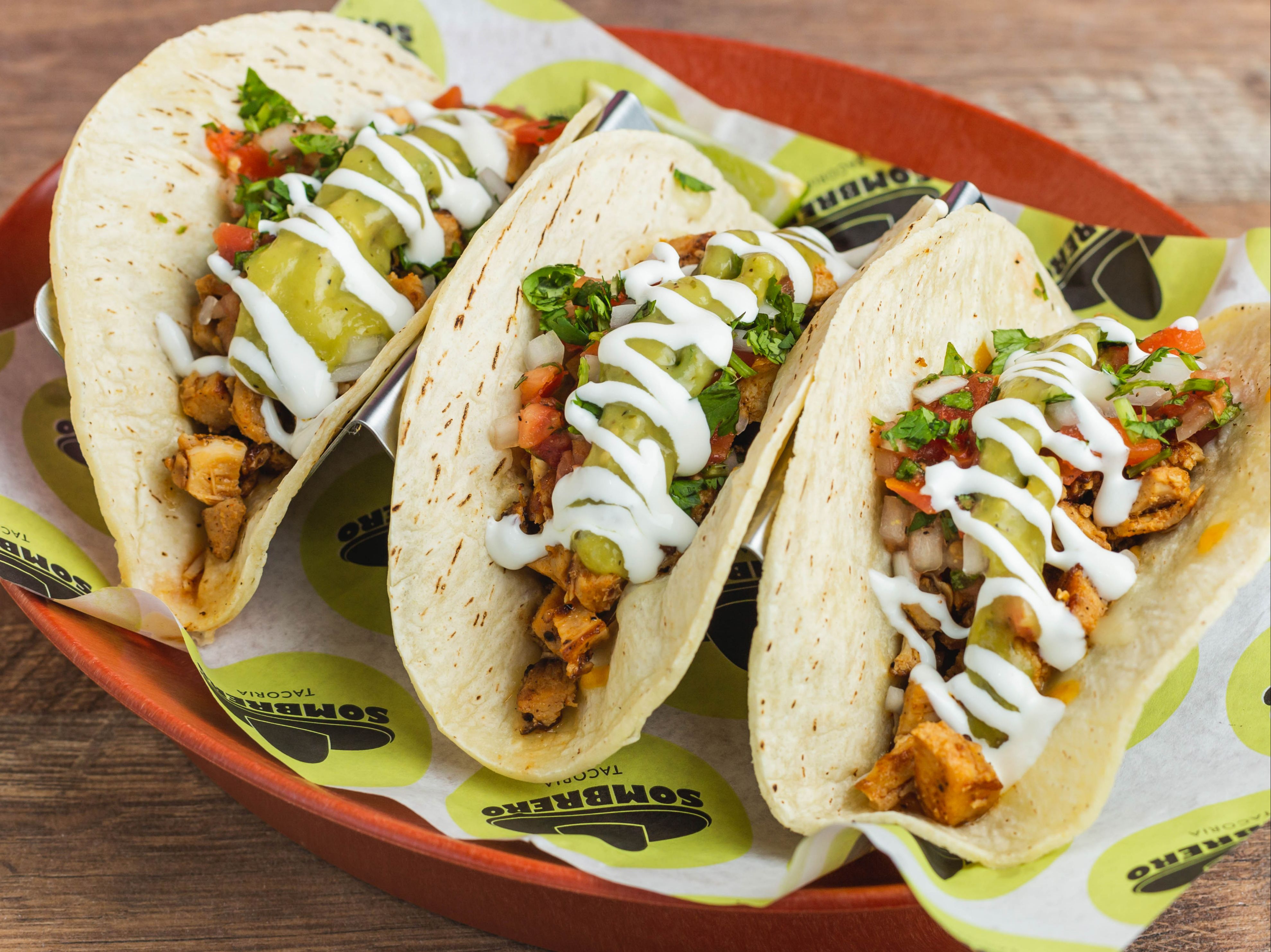 A SOMBRERO FAVORITE! OUR SIGNATURE MARINATED CHICKEN - Three Tacos, on corn tortillas with cheese, pico de gallo, tomatillo salsa, crema, cilantro & lime
