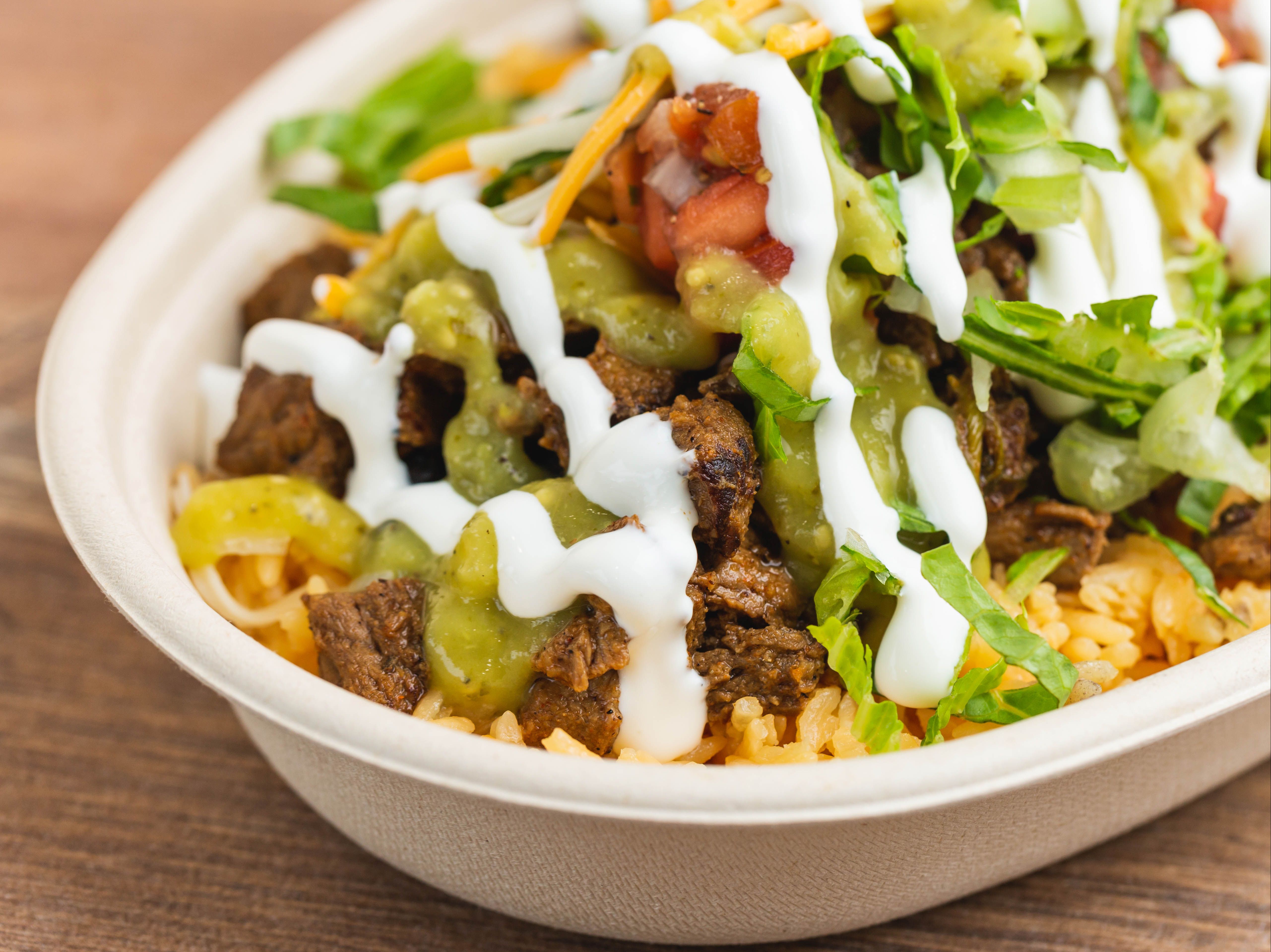 A bowl packed with our Tangy House-Marinated Stewed Beef, rice or lettuce. Topped with fajita Style peppers and onions, black beans, cheese, Pico, tomatillo salsa, crema. Served with two corn tortillas