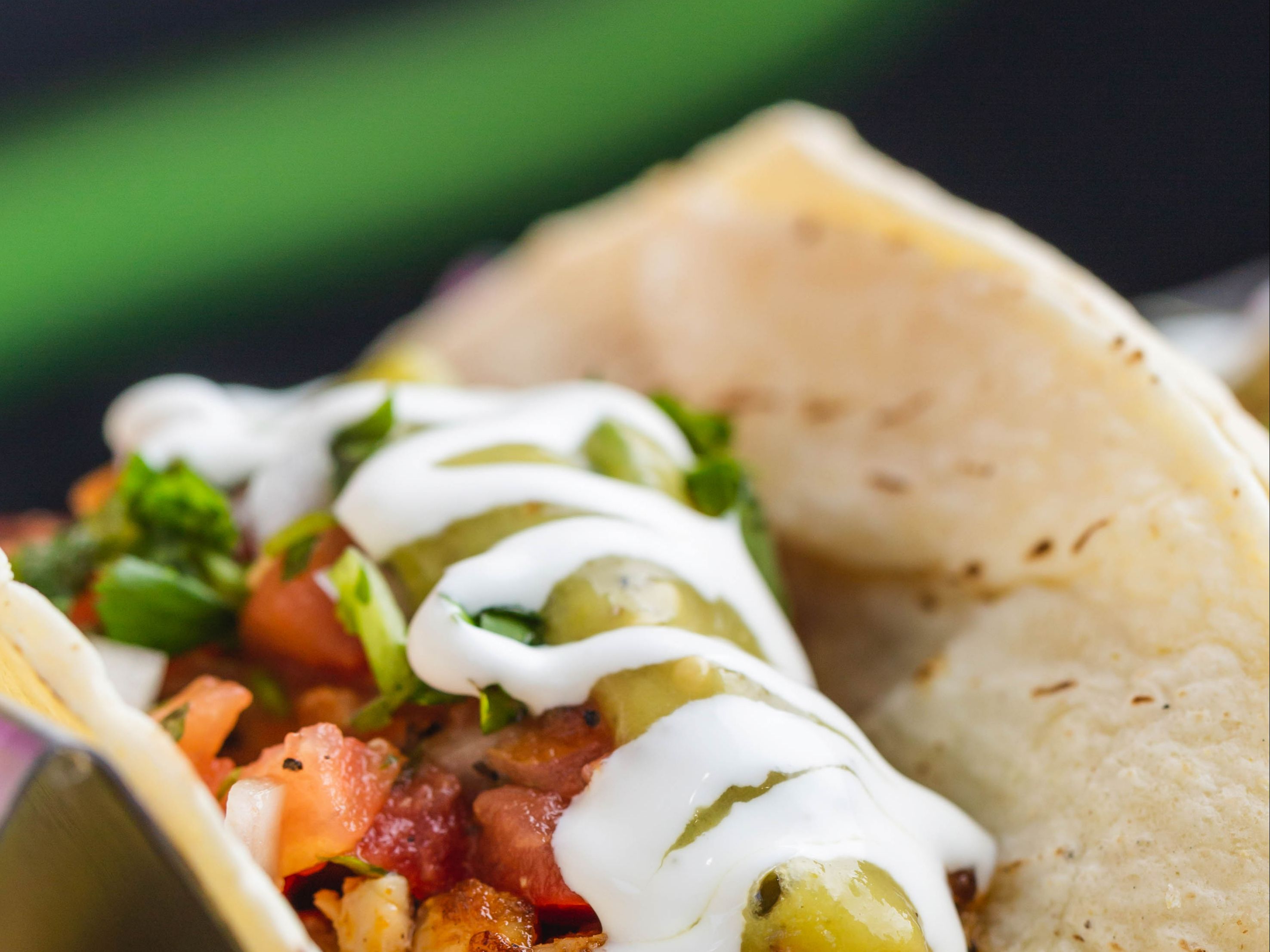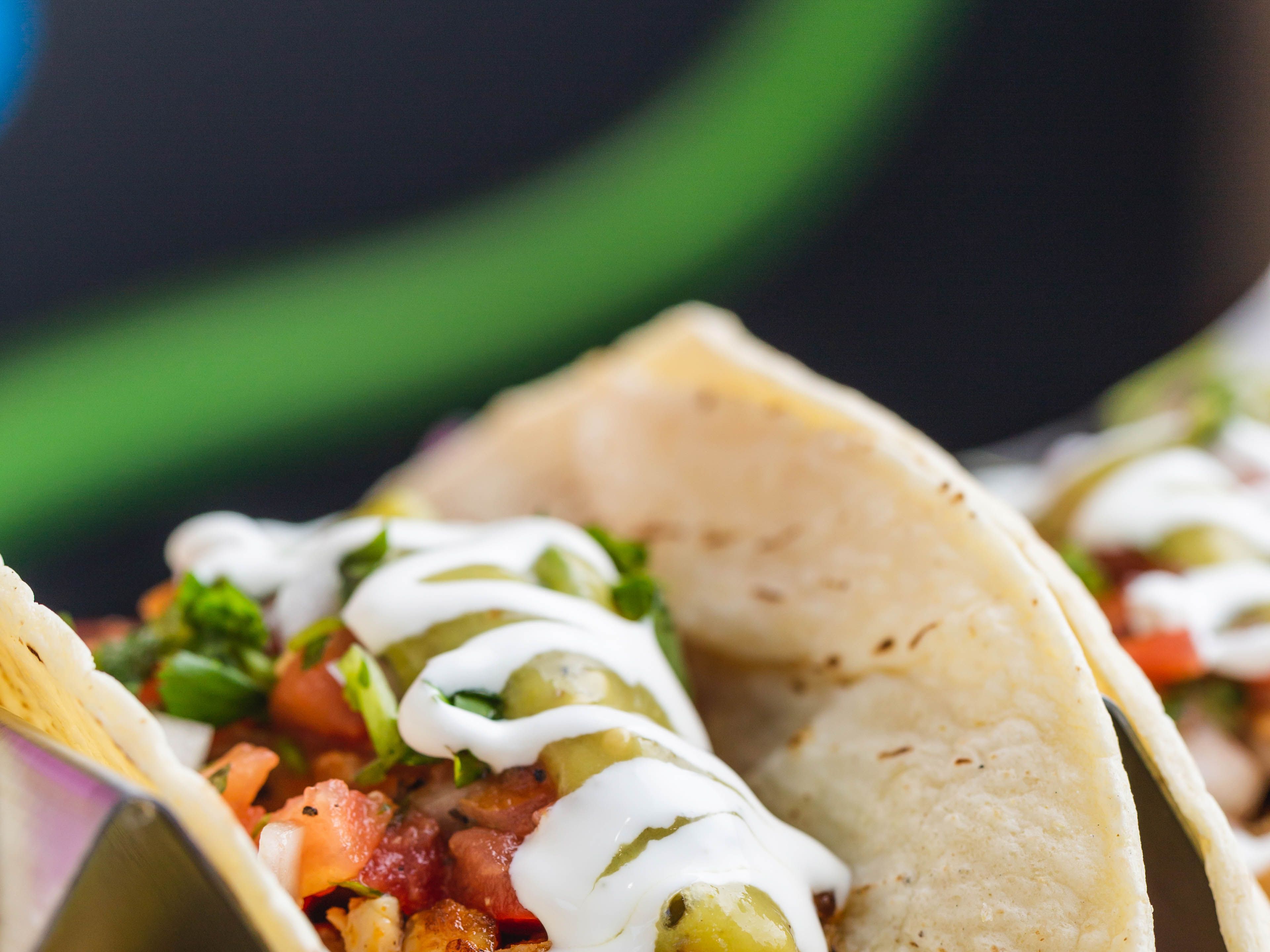 OUR TAKE ON CARNE ASADA. SEASONED AND FLAME-GRILLED TO PERFECTION! - One Taco, on a corn tortillas with cheese, pico de gallo, tomatillo salsa, crema, cilantro & lime