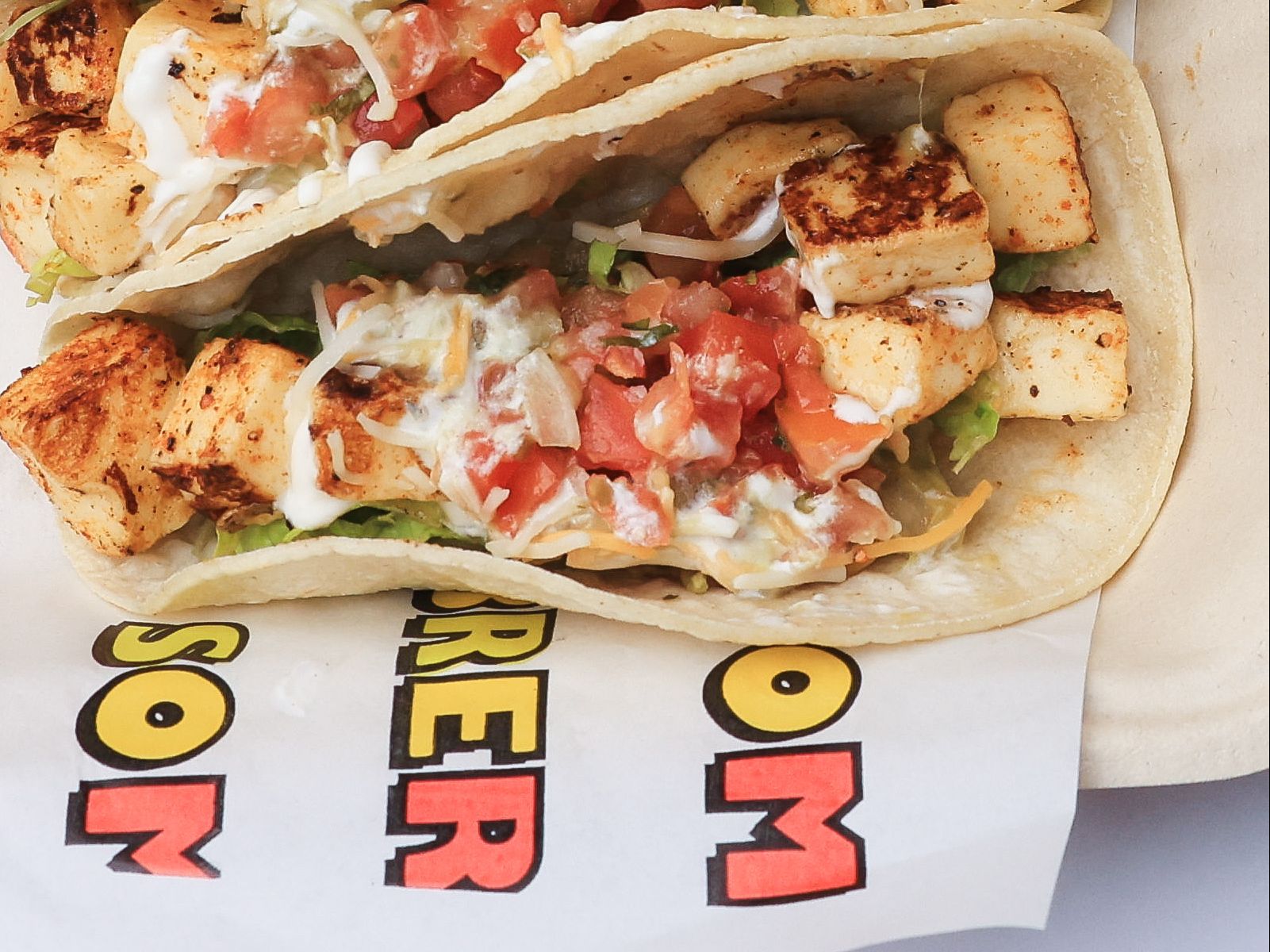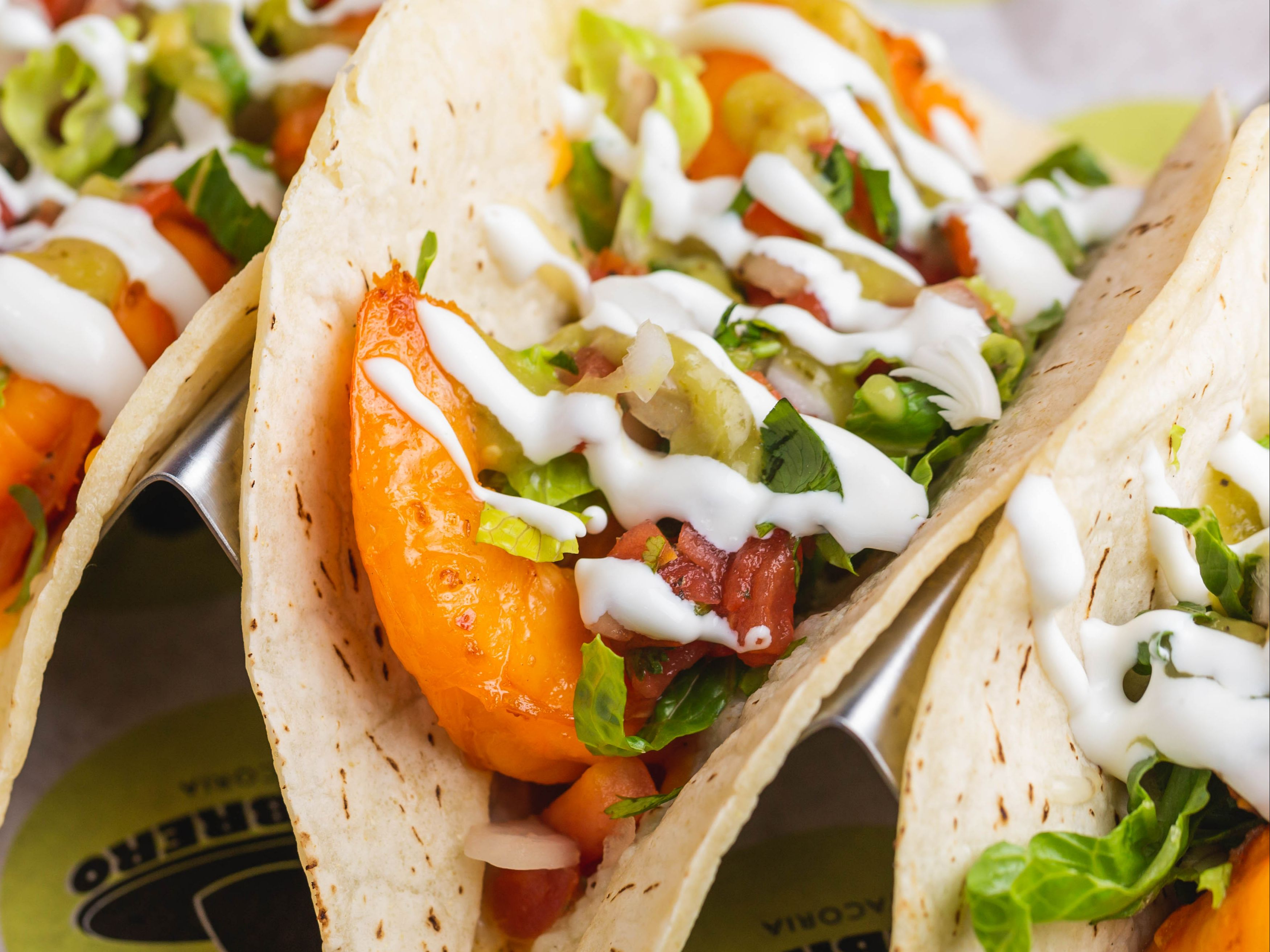 VEGETARIAN ASADO-STYLE SHROOMS! SAVORY, CITRUSY, & DELICIOUS - Three Tacos, on corn tortillas with cheese, pico de gallo, tomatillo salsa, crema, cilantro & lime