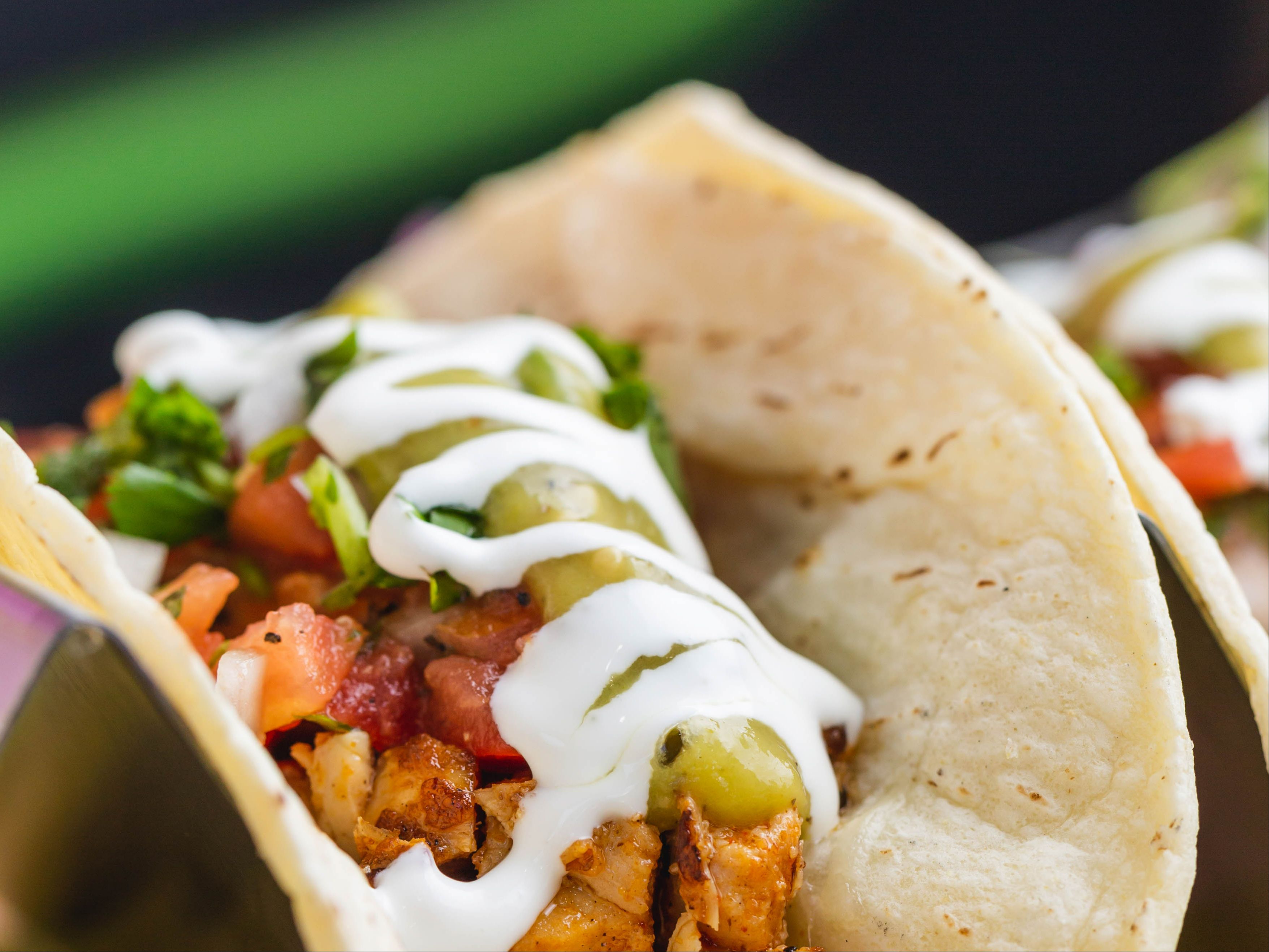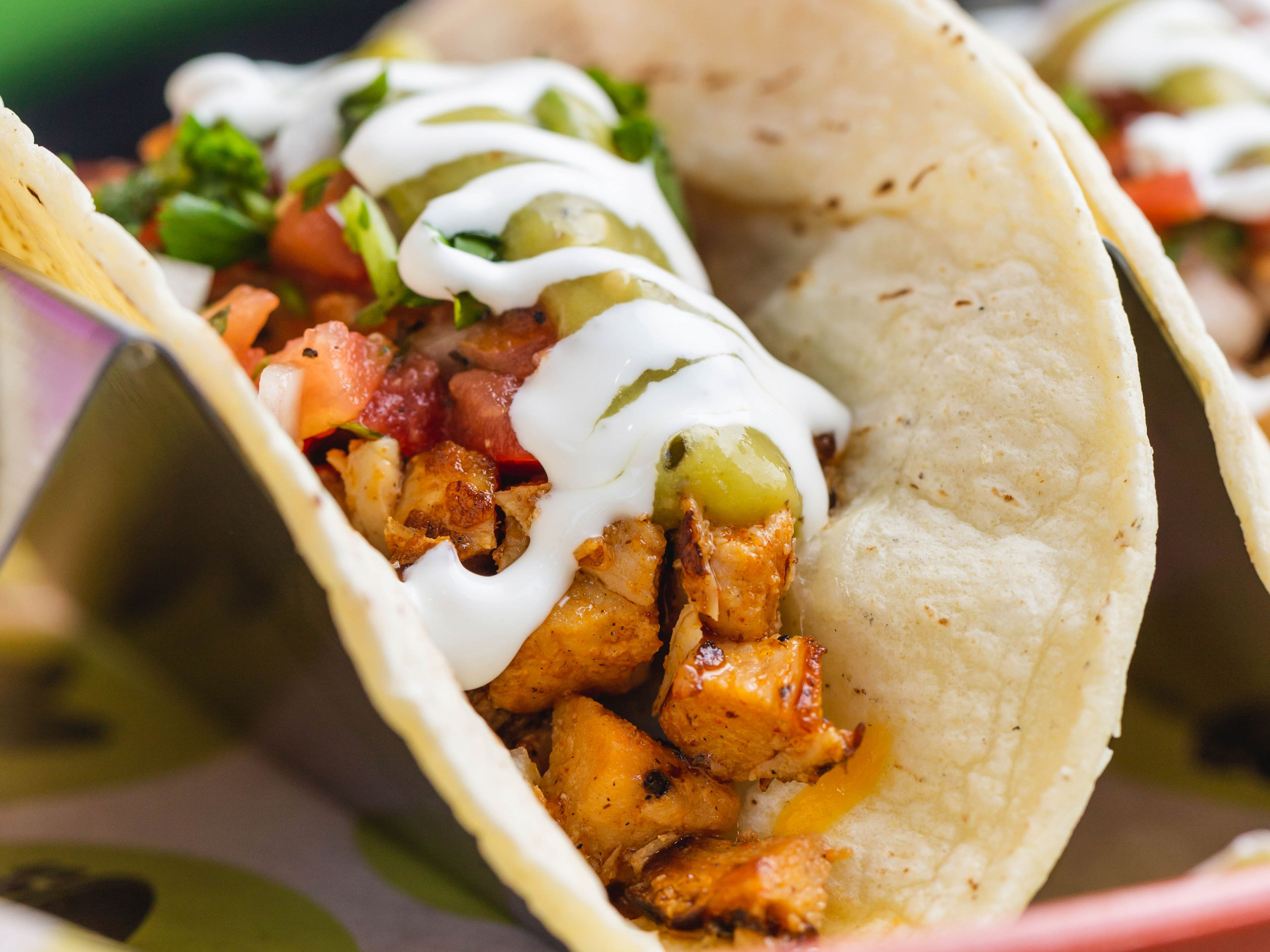 A SOMBRERO FAVORITE! OUR SIGNATURE MARINATED CHICKEN - One Taco, on a corn tortillas with cheese, pico de gallo, tomatillo salsa, crema, cilantro & lime