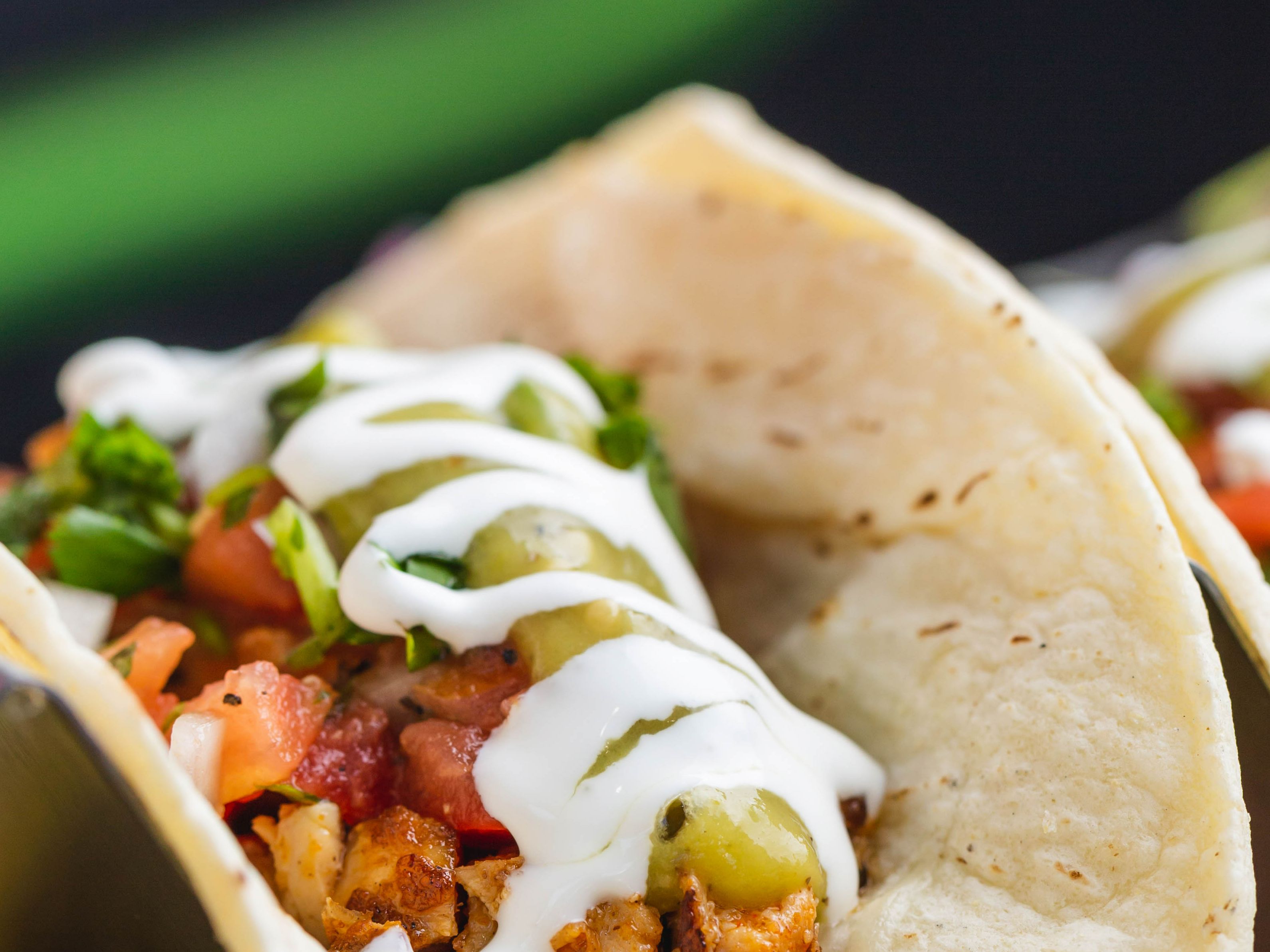OUR SIGNATURE MARINADE WITH A SPLASH OF CITRUS SEARED HOT ON OUR FLAT-TOP GRILL - Three Tacos, on corn tortillas with cheese, pico de gallo, tomatillo salsa, crema, cilantro & lime