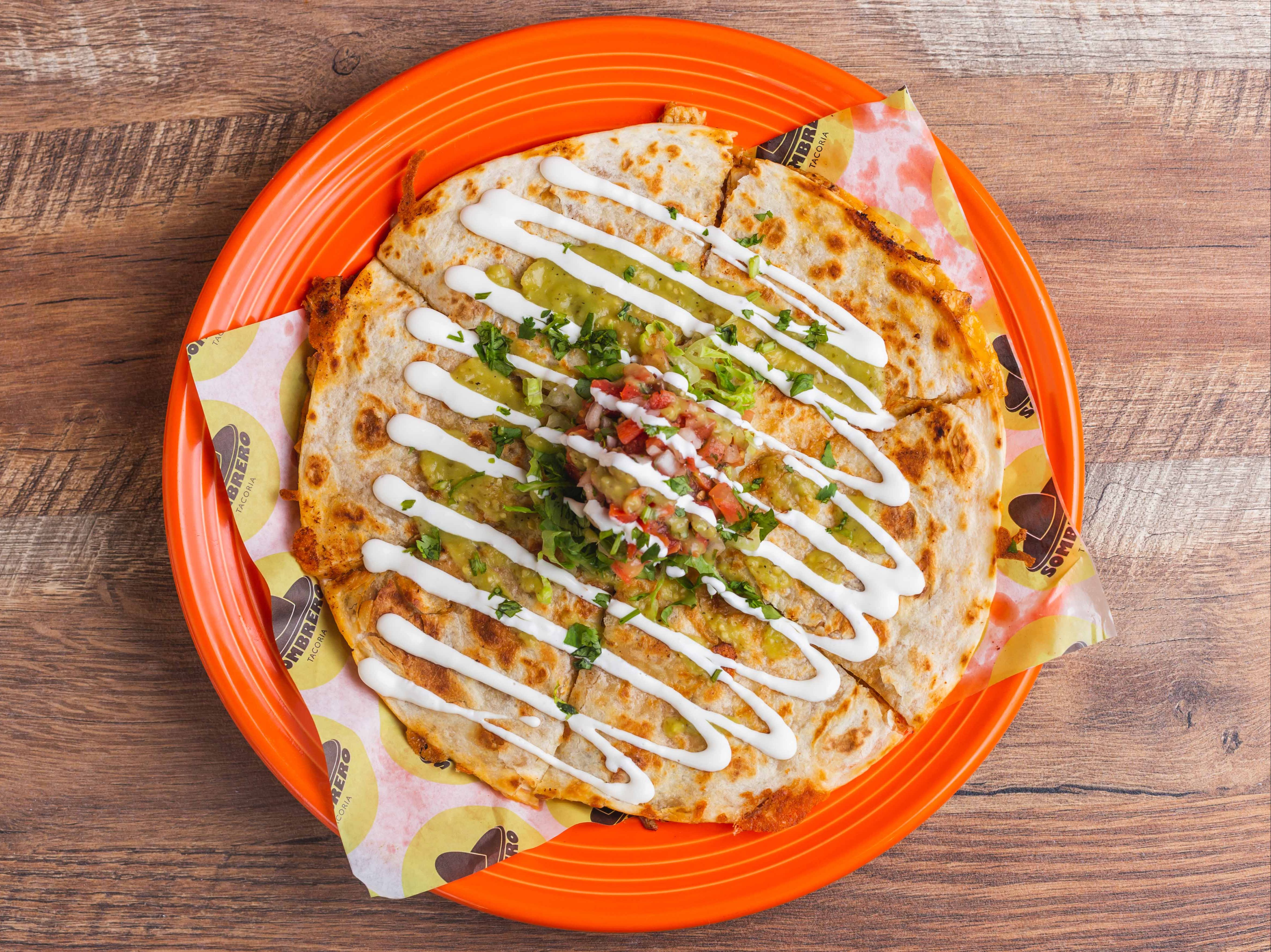 A 10” flour tortilla filled with melted mexican cheese and your choice of filling. Topped with lettuce, pico, tomatillo salsa and crema