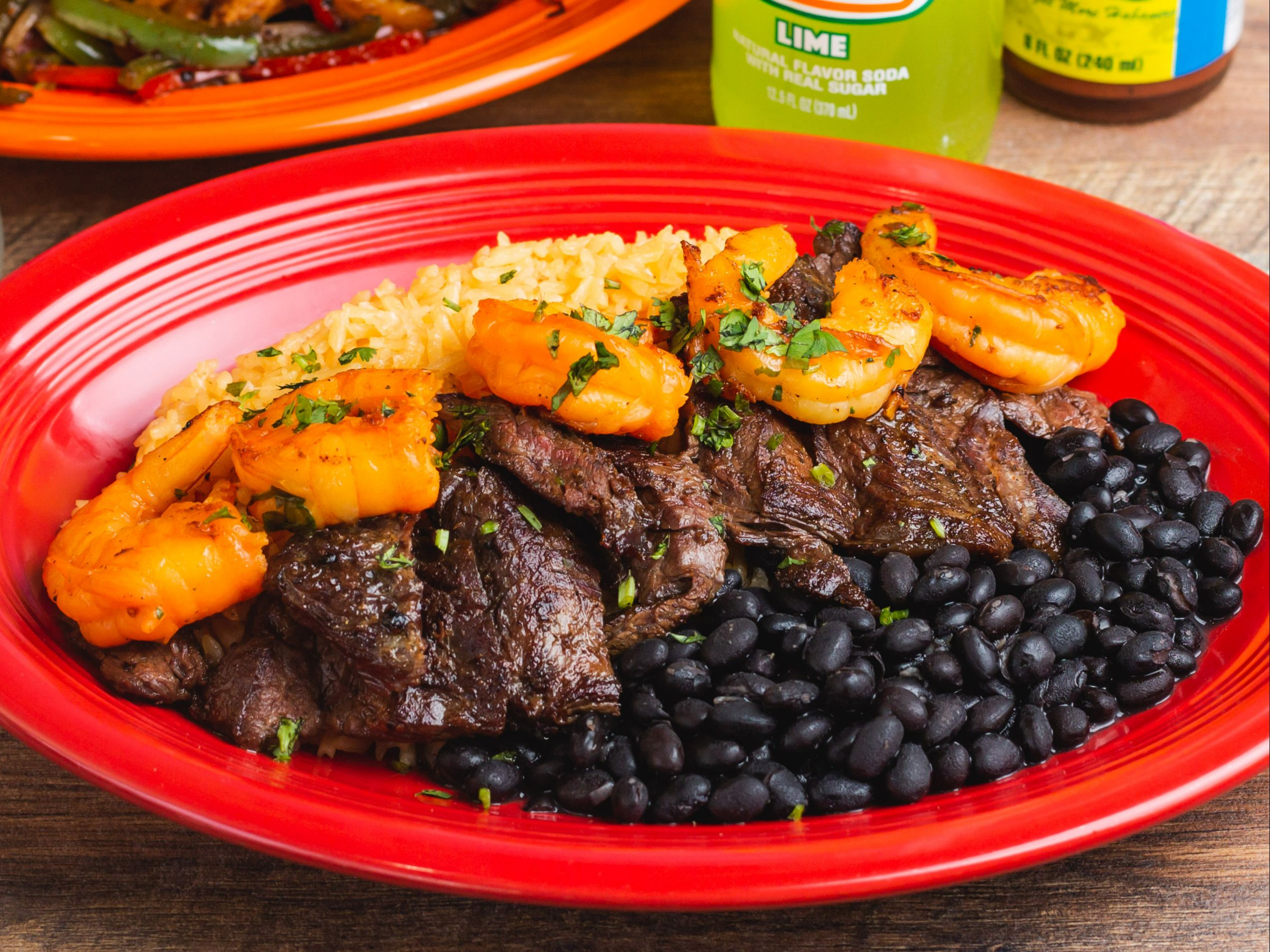 Our Marinated Carne Asada & Shrimp, Served with Rice, Beans, Maduros and Salad
