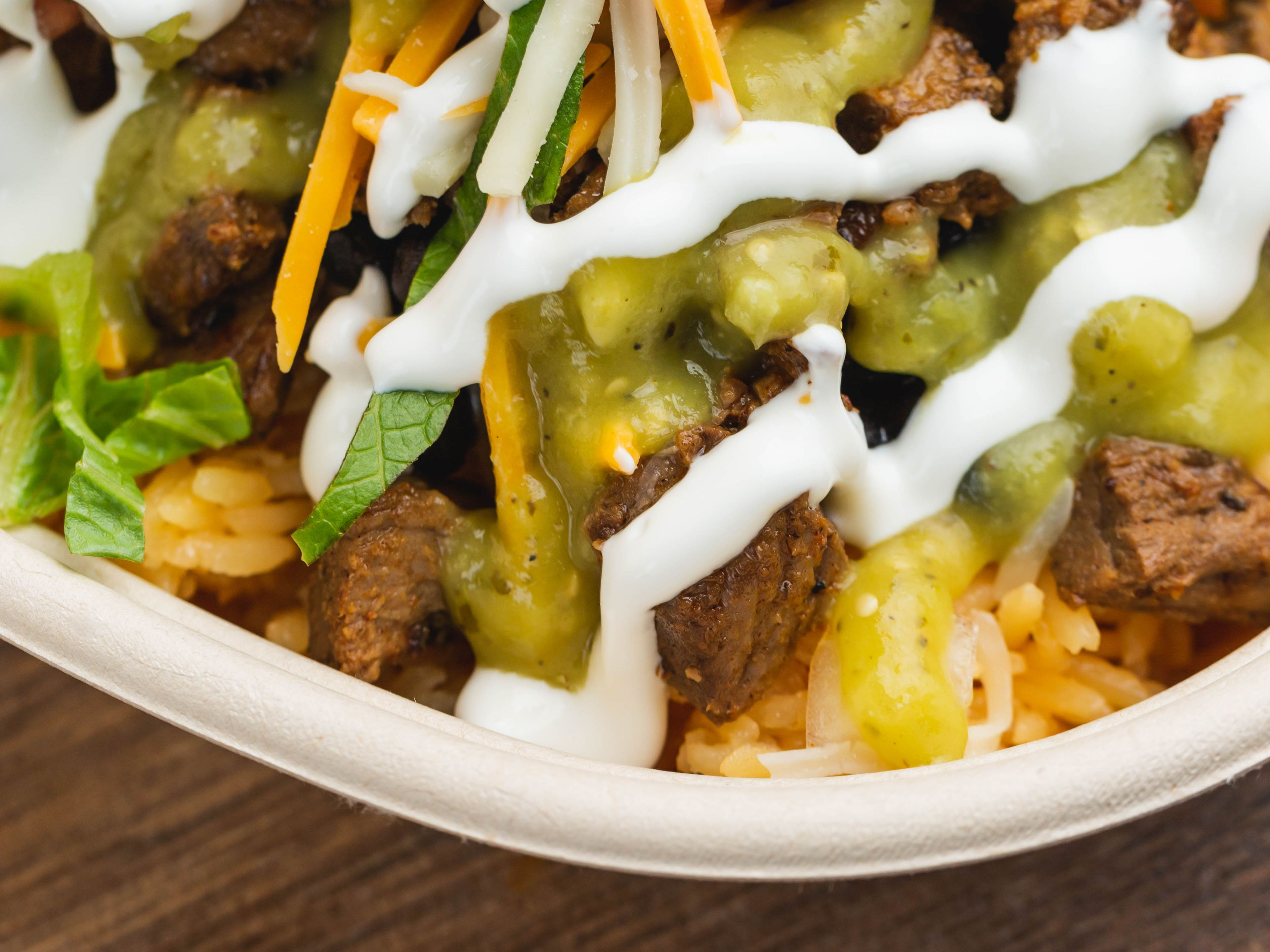 OUR TAKE ON CARNE ASADA. SEASONED AND FLAME-GRILLED TO PERFECTION! - Served with rice or lettuce. Topped with black beans, cheese, pico, tomatillo salsa, & crema
