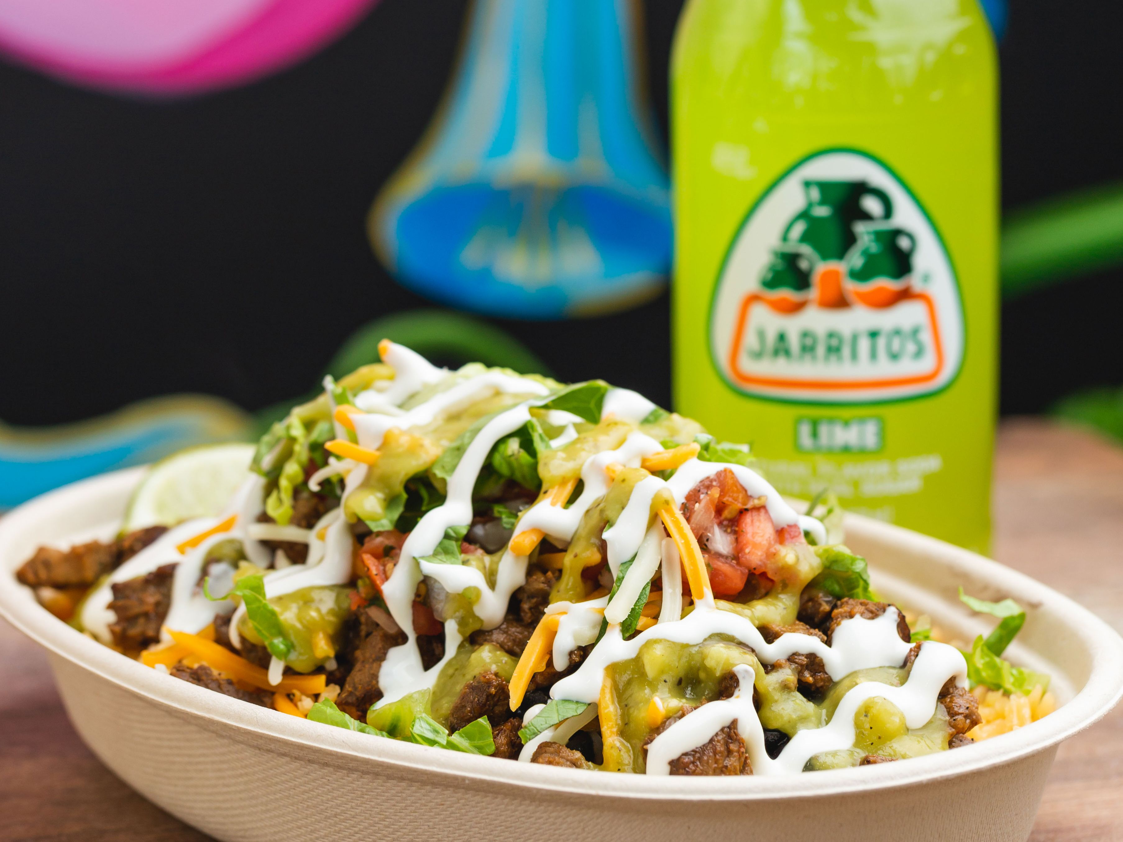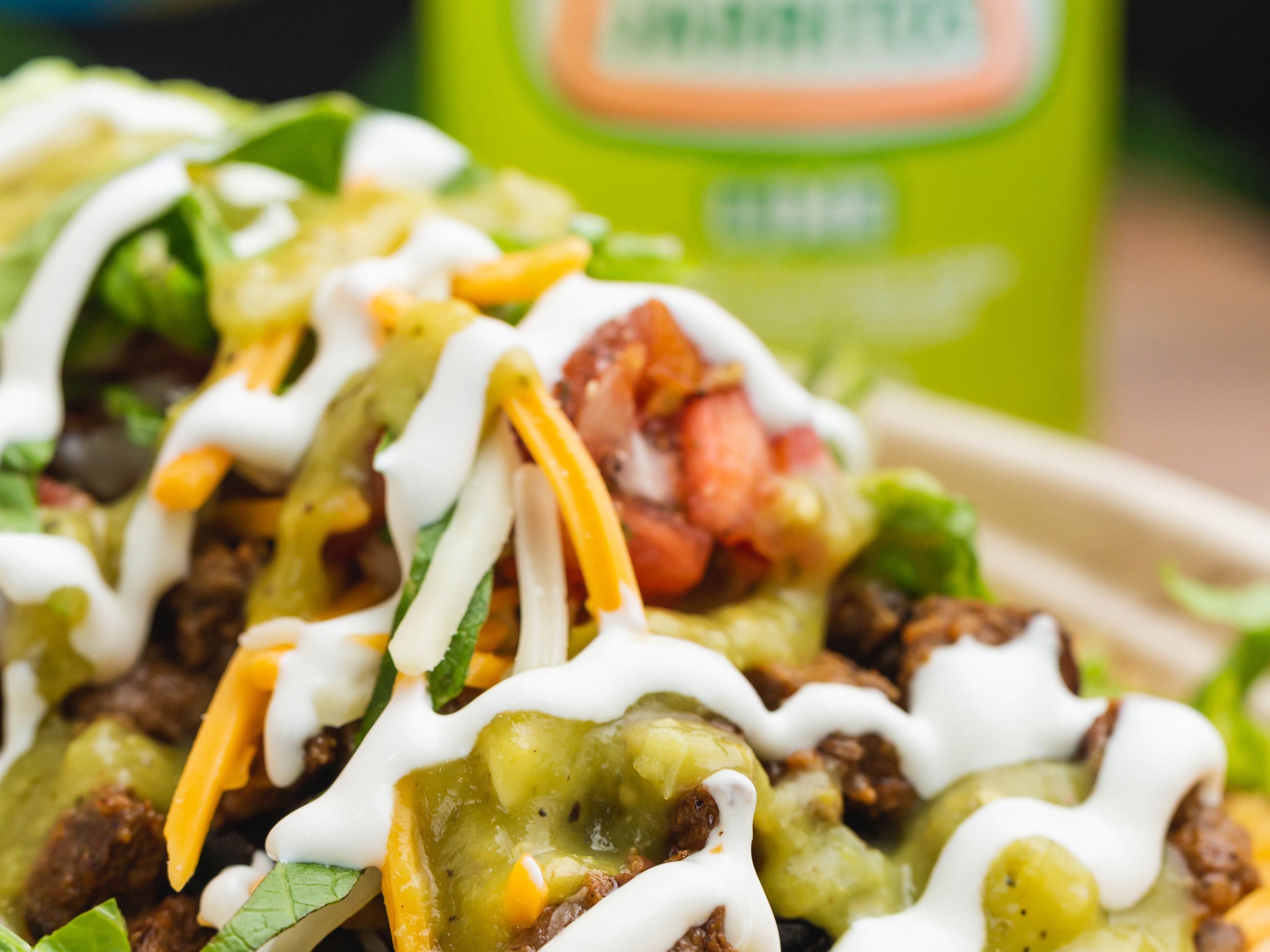 French fries topped with queso, pico, tomatillo salsa, cilantro, chili con carne & crema