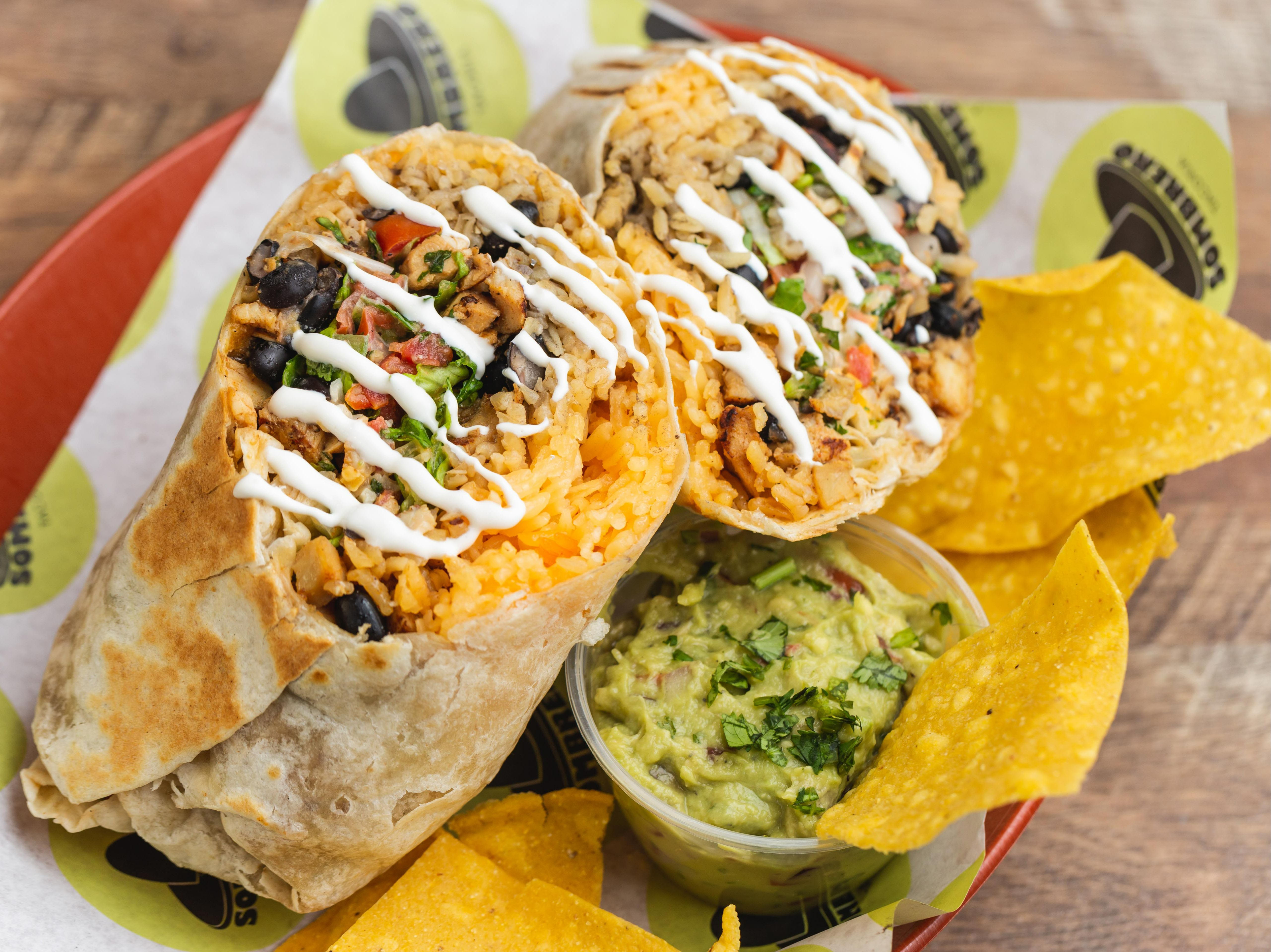 VEGETARIAN ASADO-STYLE SHROOMS! SAVORY, CITRUSY, & DELICIOUS - packed with rice or lettuce. Topped with black beans, cheese, pico, tomatillo salsa, & crema, wrapped in a 12" flour tortilla.
