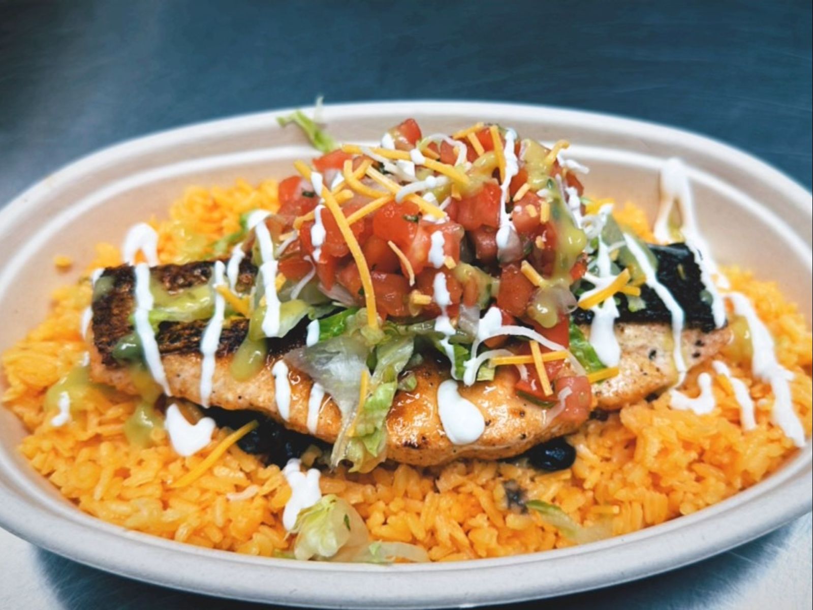 GRILLED SALMON - Served with rice or lettuce. Topped with black beans, cheese, pico, tomatillo salsa, & crema.
