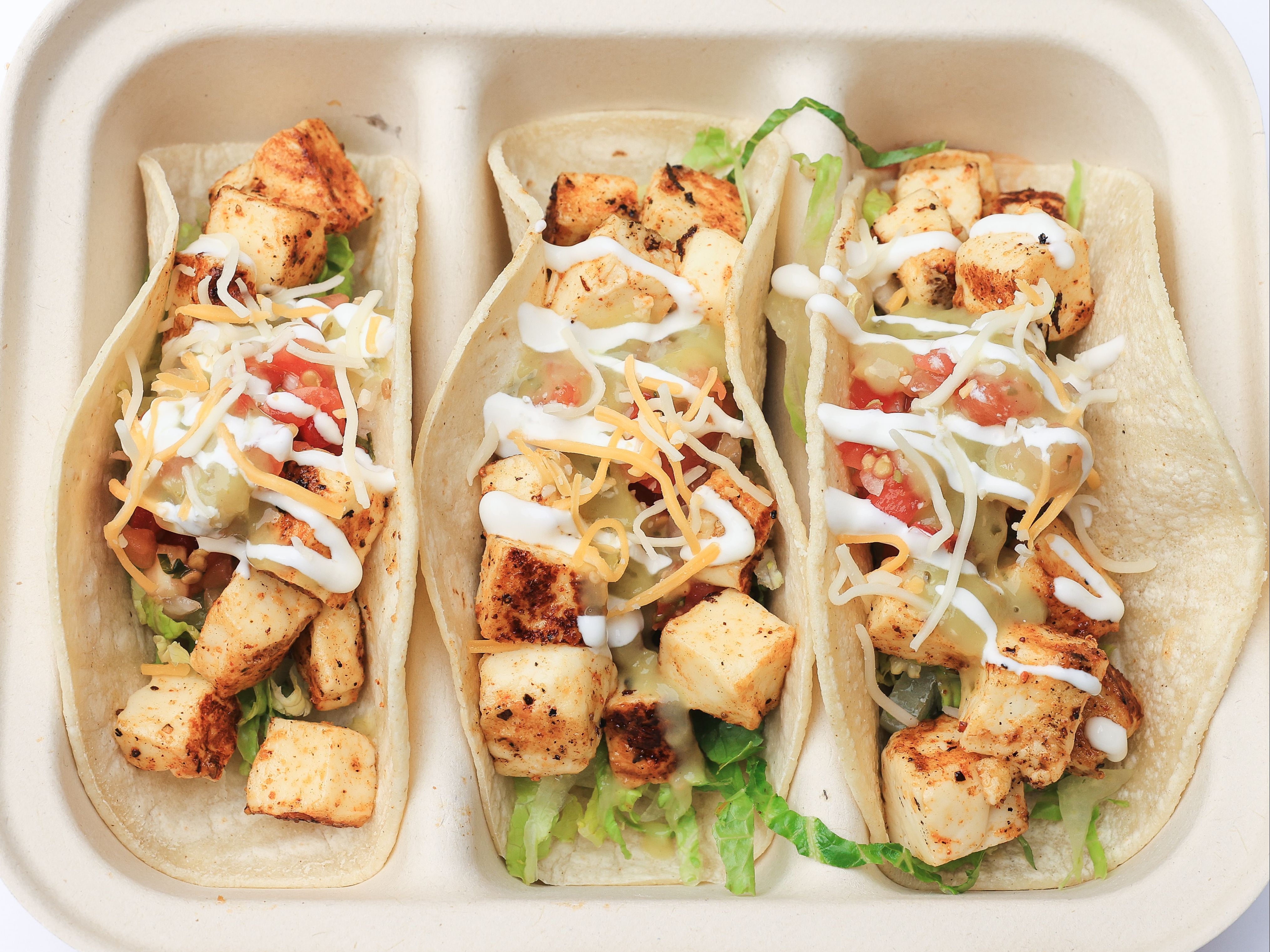 SEASONED & MARINATED CRISPY TILAPIA - Three Tacos, on corn tortillas with cheese, pico de gallo, tomatillo salsa, crema, cilantro & lime