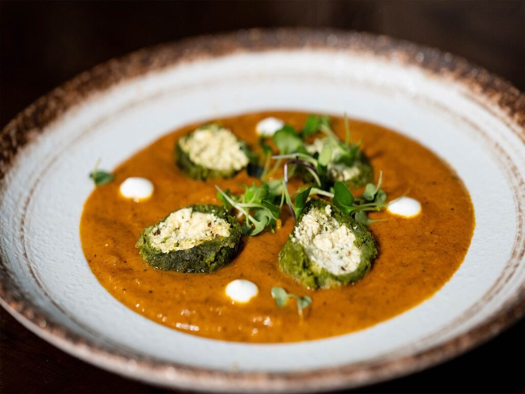 Fried Spinach dumplings with cottage cheese filling with creamy tomato gravy, infused with Indian spices
