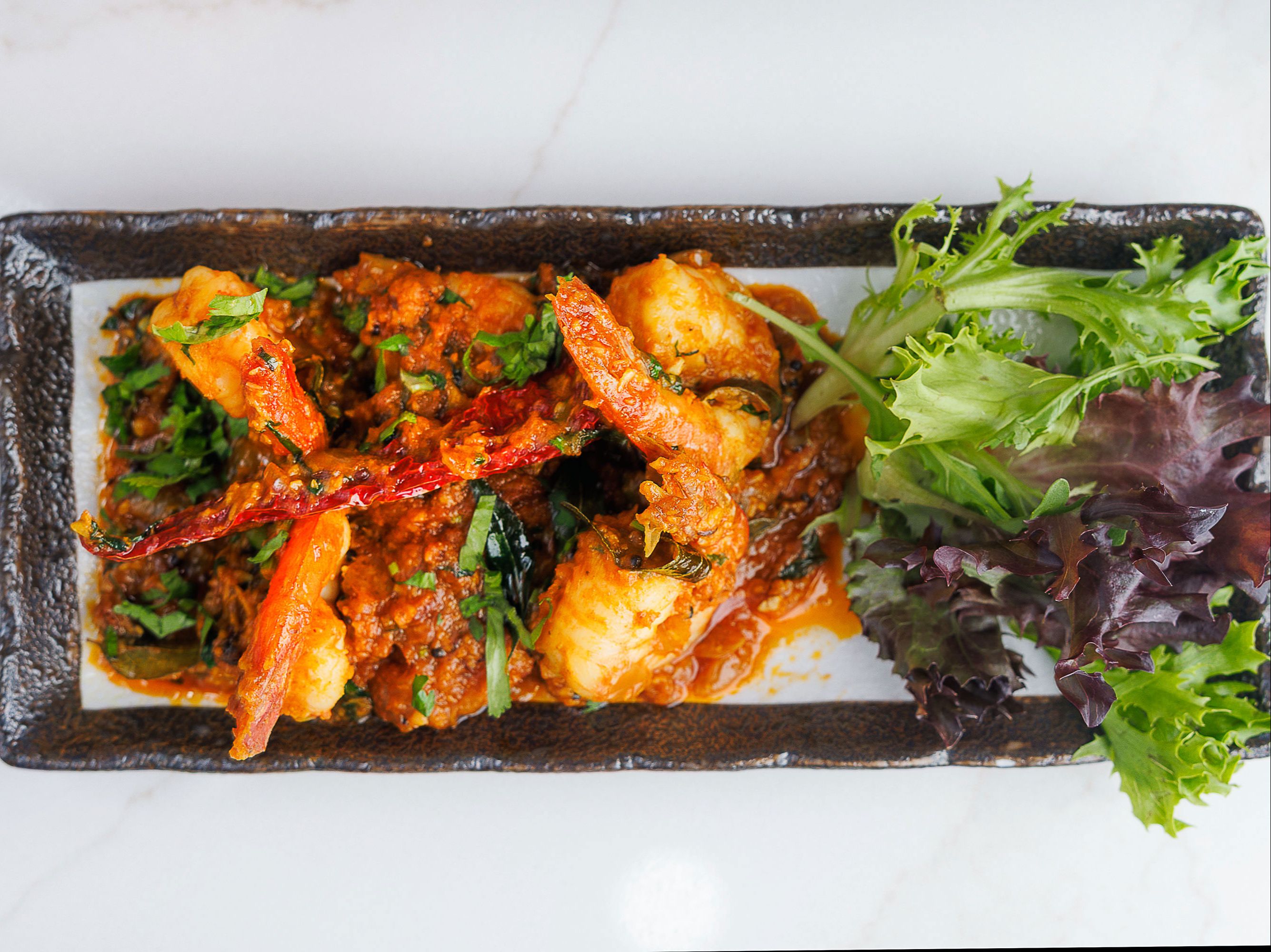 Shrimp cooked in a wok with garlic, freshly ground spices, peppers & onions